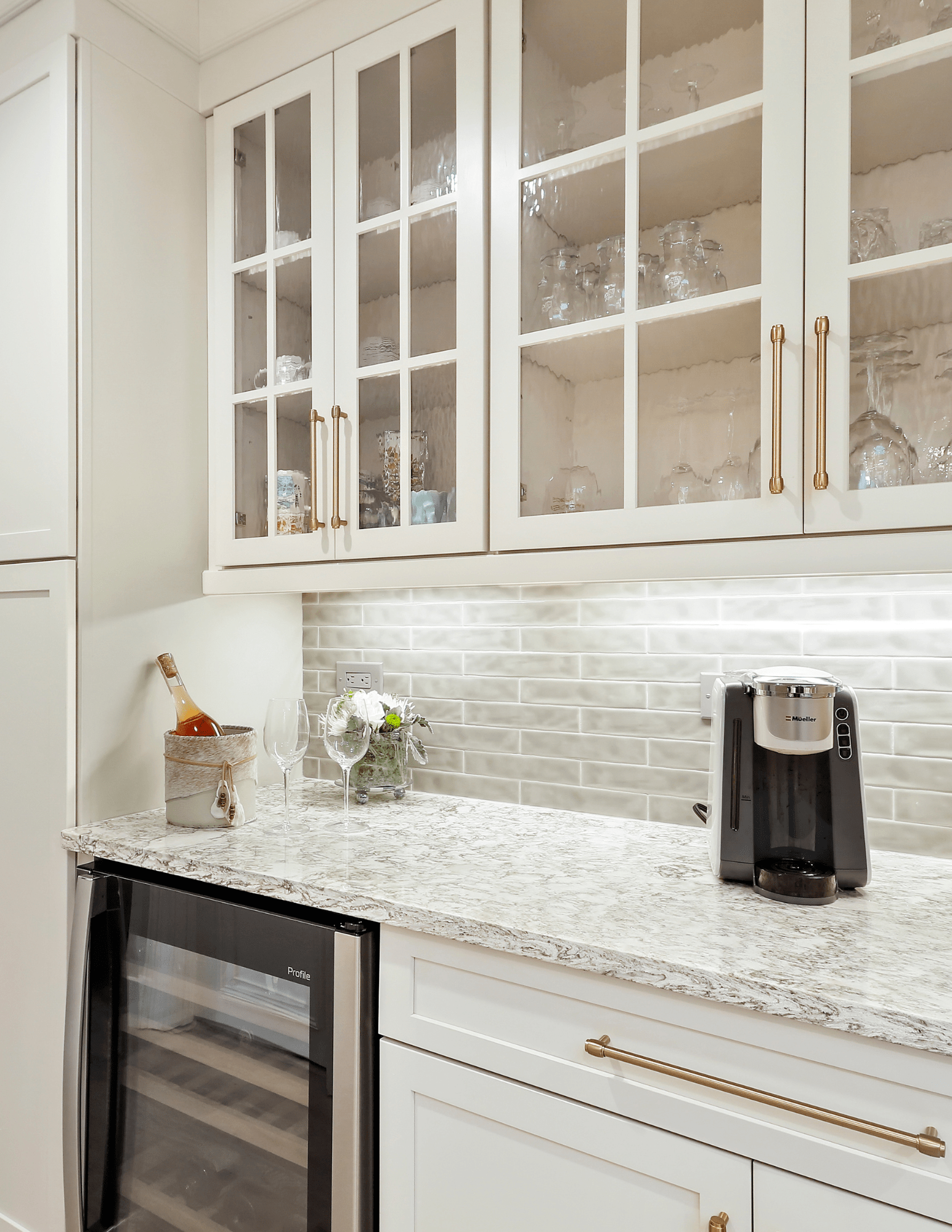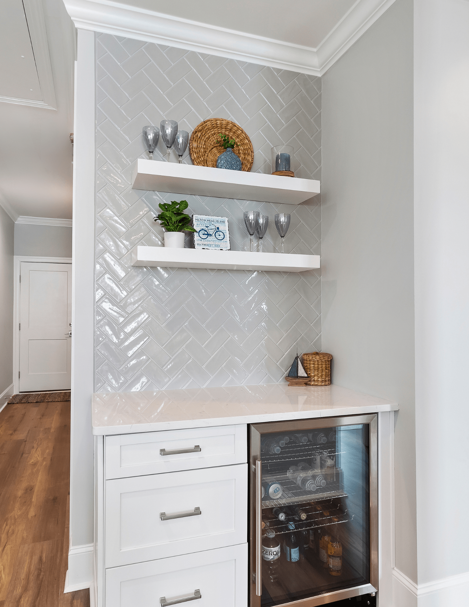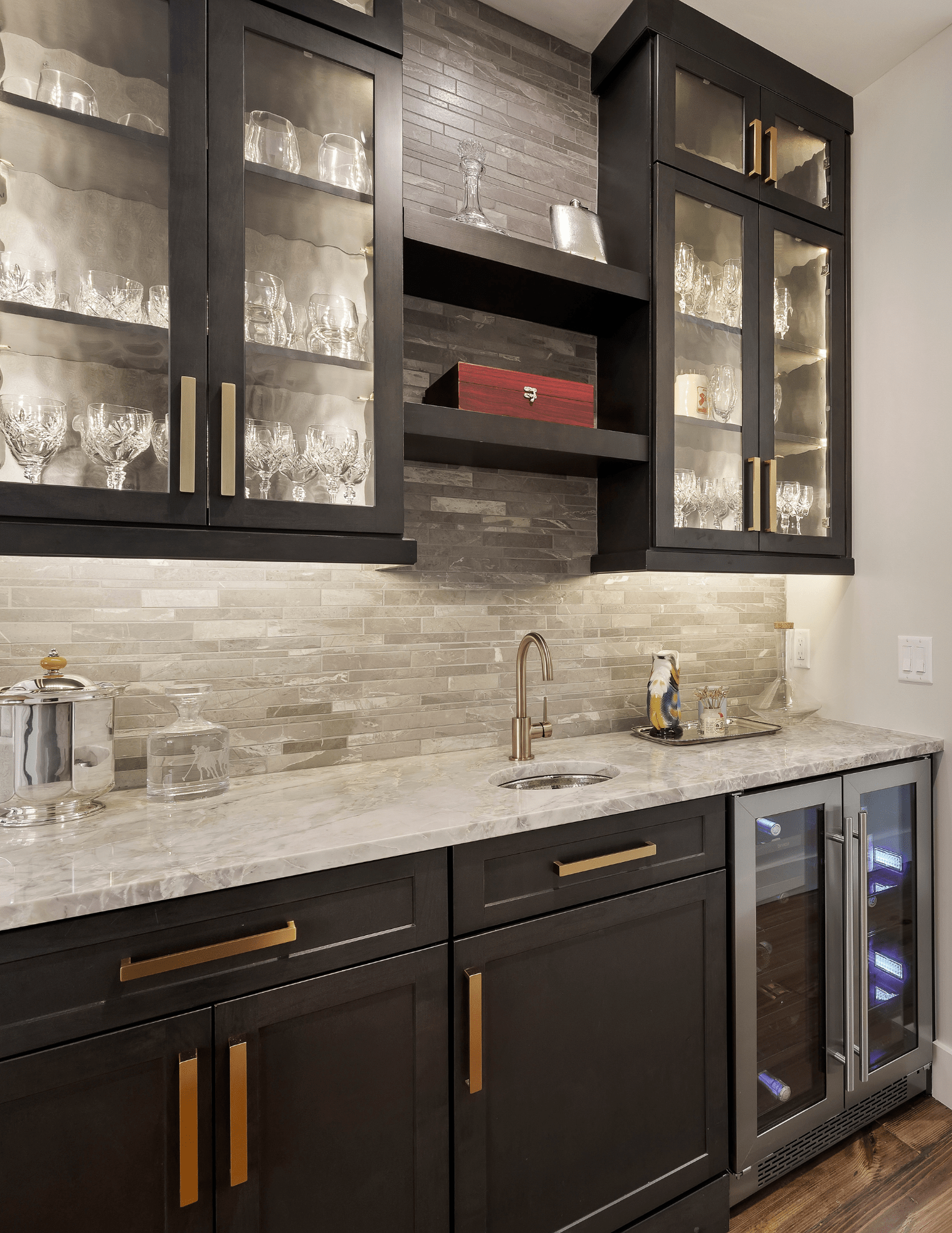 Tip: Consider floating shelves and glass door cabinets to give your dry bar a light, open feel.