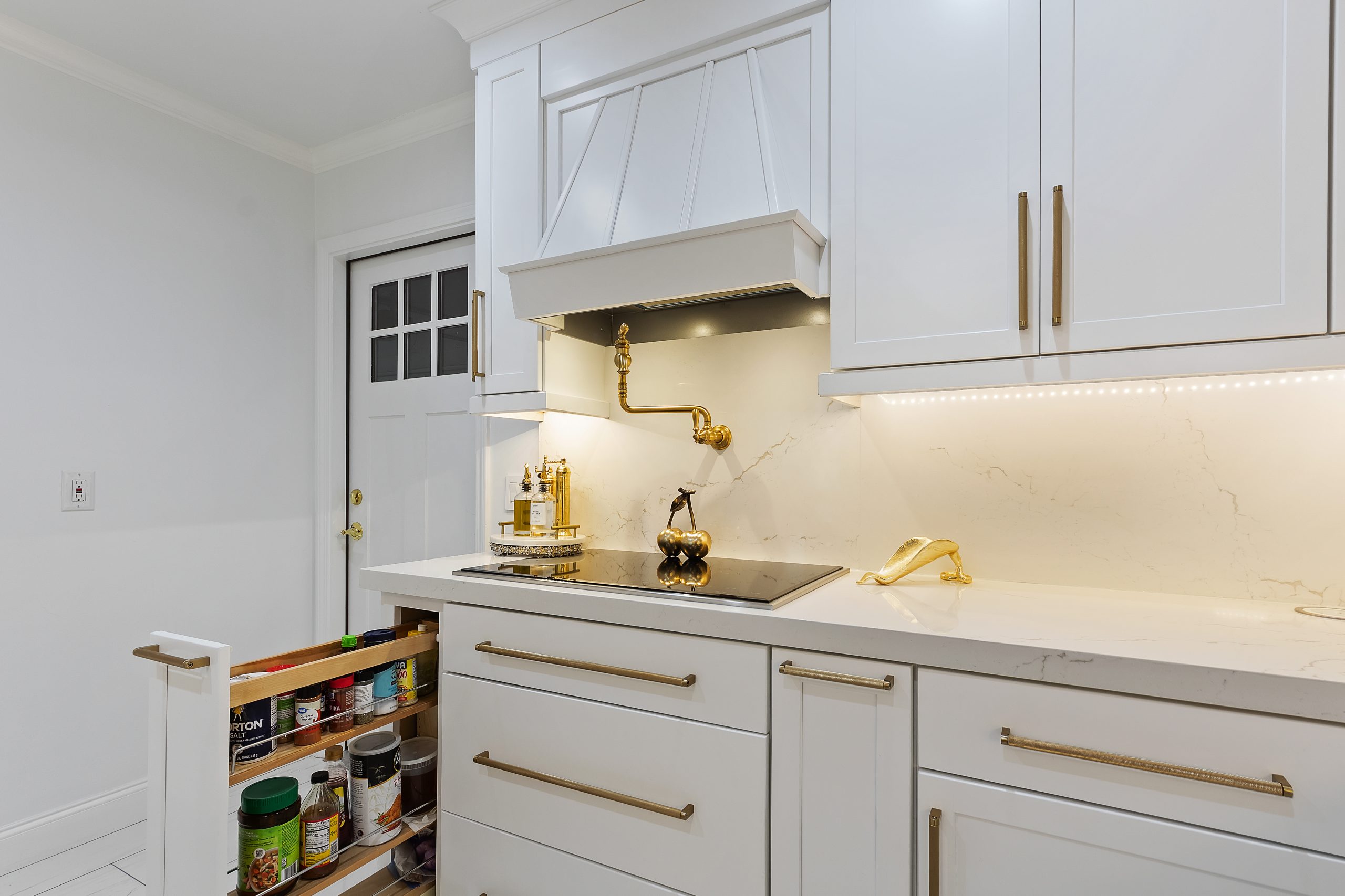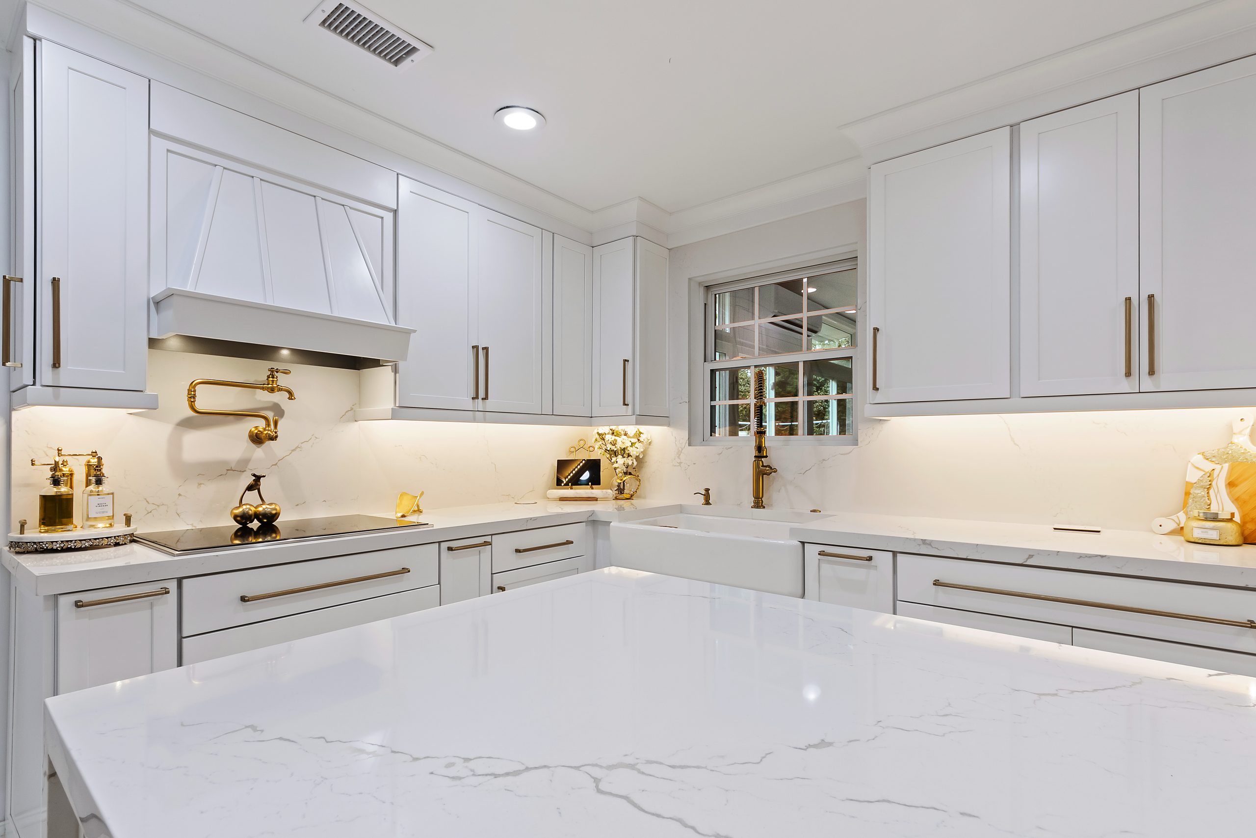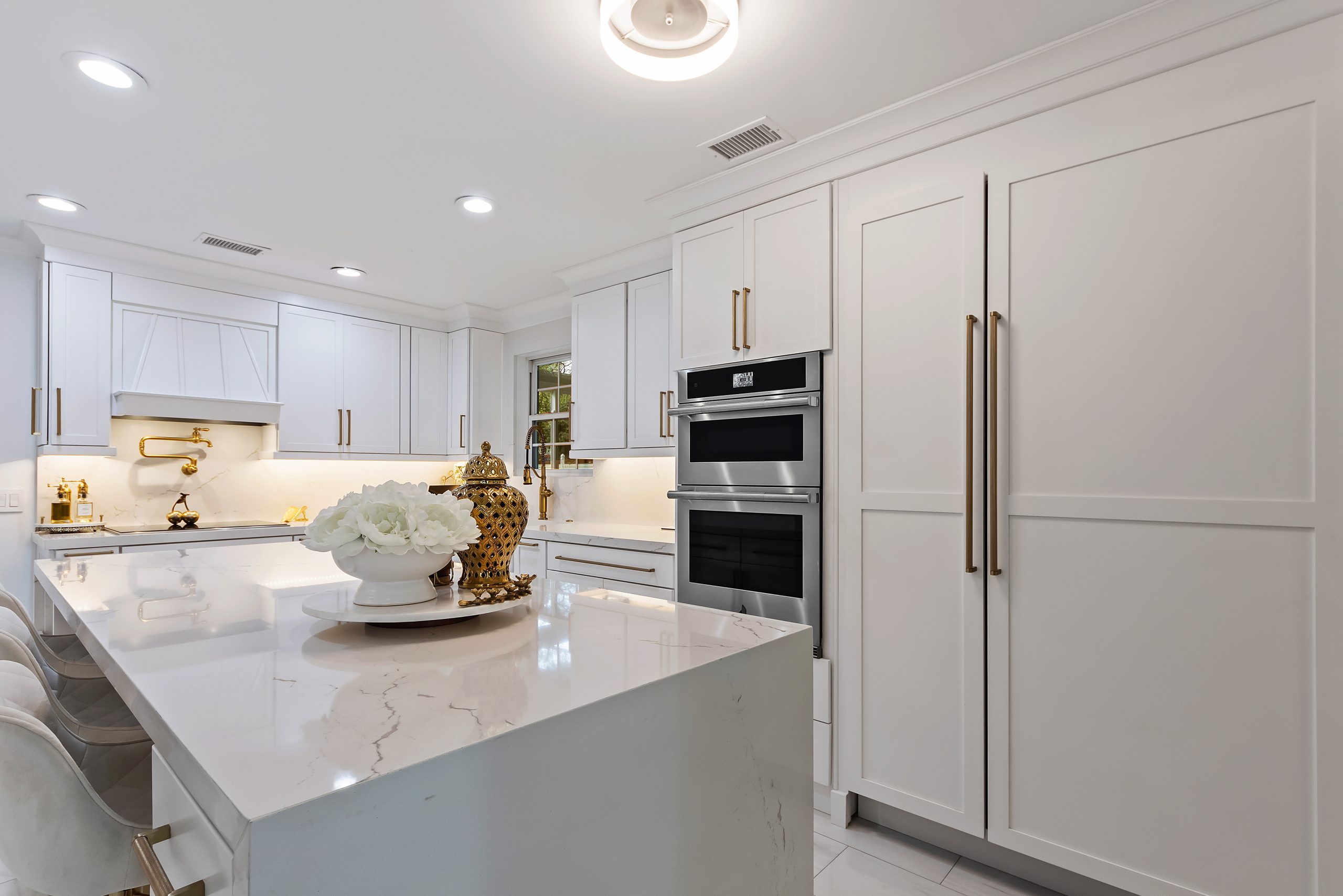 The award-winning projects featured stunning details such as white shaker-style semi-custom cabinetry, Cambria countertops, and innovative storage solutions. These designs exemplify our dedication to blending aesthetics with functionality.
