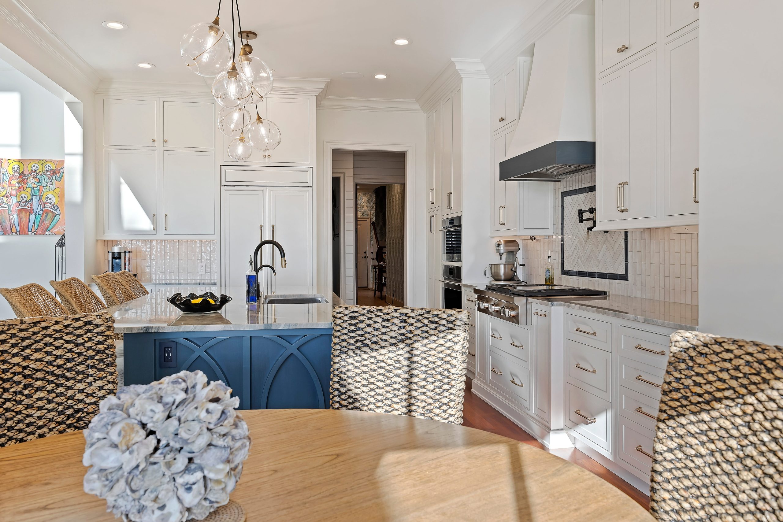 This stunning Bluffton, SC kitchen remodel features Shiloh Cabinetry with modern inset cabinets in Polar White, complemented by a bold island in Hudson Blue that anchors the space with coastal character. The open layout was designed to celebrate the home’s marsh views and natural Lowcountry sunlight, creating a bright and welcoming gathering space. With clean lines, timeless inset cabinetry, and a relaxed coastal aesthetic, this kitchen blends beauty and functionality for a space that feels effortlessly elegant and perfectly suited to Bluffton coastal living.