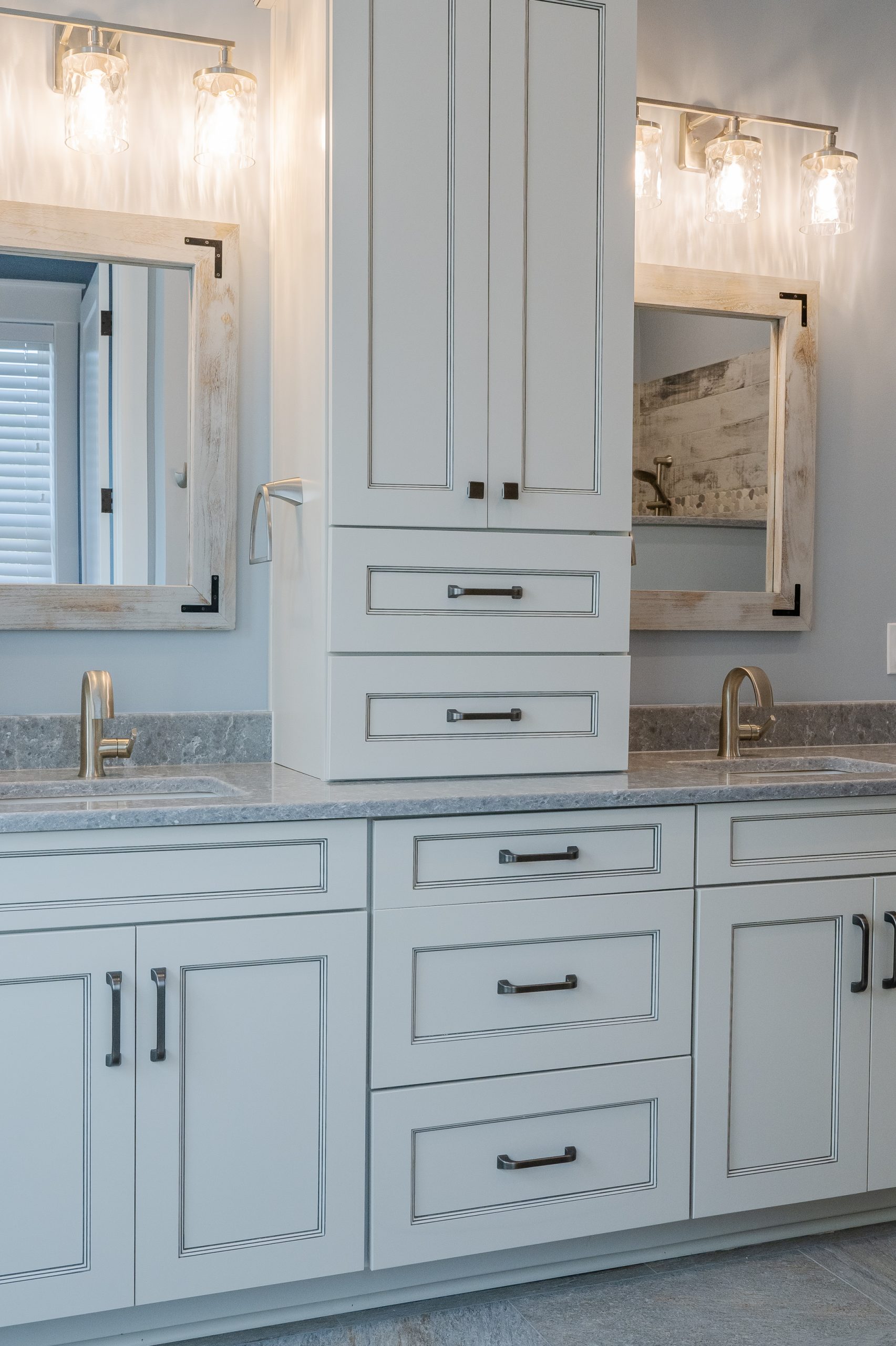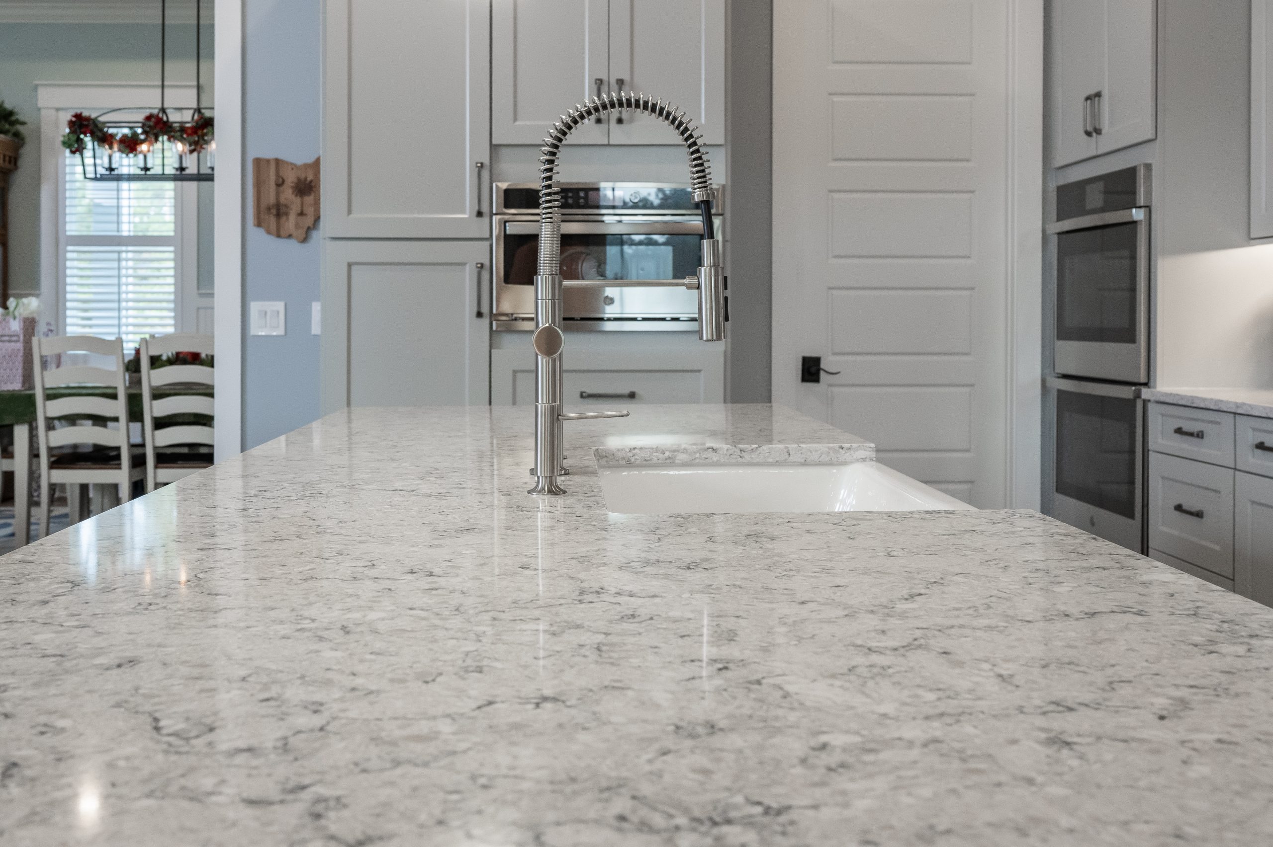 Hardeeville, SC new construction – Farmhouse-meets-Industrial Kitchen showcasing Marsh Kitchen Cabinets in medium grey, full-overlay base & wall cabinets with a contrasting wood stained kitchen island. Sedgefield Style upper and lower shaker kitchen cabinets in Greystone with a mocha glaze, with matching vent hood. The style has a distinctive molding around the recessed center panel and is variation of a popular shaker style cabinet.