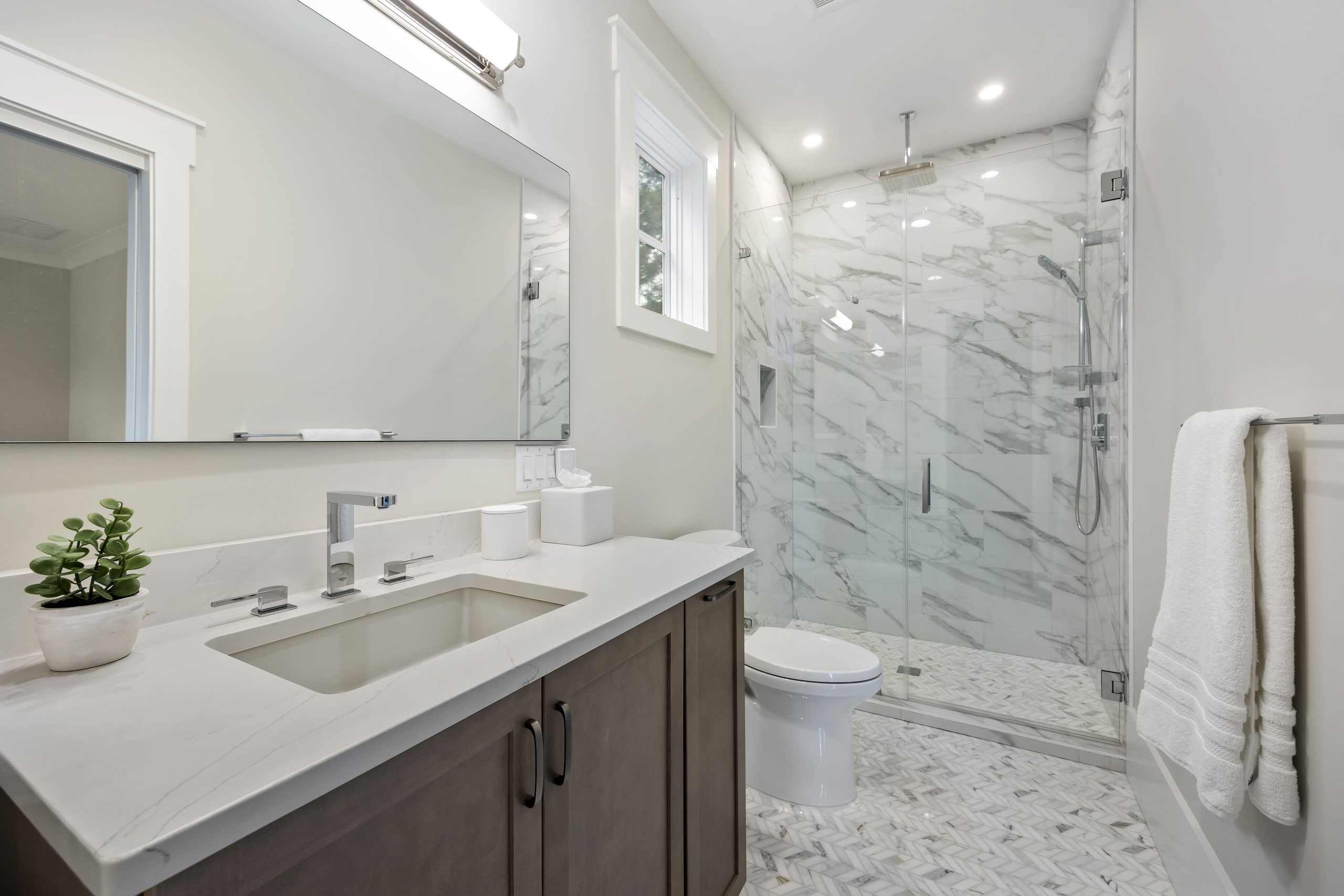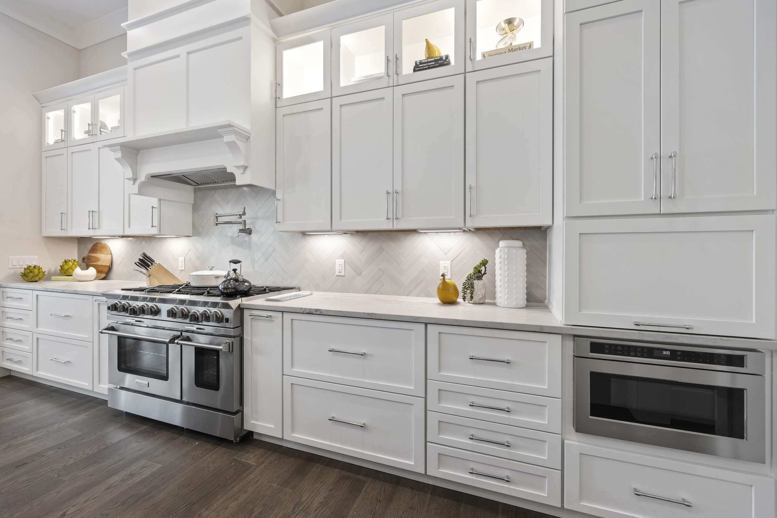 Transforming new construction in Hilton Head’s exclusive Leamington Subdivision, Kitchen Design Solutions, one of the best kitchen designers in Hilton Head, has crafted a luxury kitchen remodel that seamlessly blends style and functionality. This design features Marsh Cabinets and Starmark Cabinetry, with white Bridgeport cabinets for the perimeter and butler’s pantry and a striking oversized kitchen island. Thoughtful details like tray, utensil, and spice pull-outs, along with a panel-ready trash compactor, enhance organization. Finished with Richelieu hardware and a herringbone tile backsplash, this showcase kitchen remodel is the top choice for high-end cabinetry and custom kitchen design in Leamington.